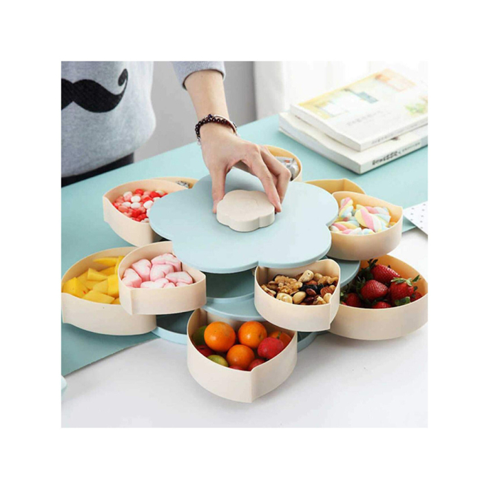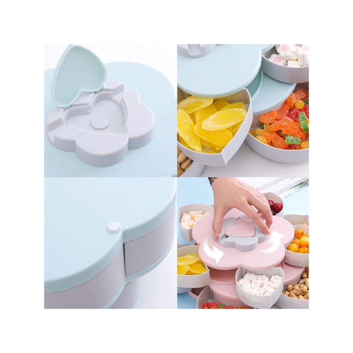 Tento multifunkční rotační organizér se stojánkem na mobilní telefon by neměl chybět v žádné moderní domácnosti, obzvláště pokud často hostíte své přátele, blízké či si jen rádi dopřejete různé pochoutky v pohodlí domova. Organizér je uzpůsoben tak, aby bylo možné do několika výsuvných zásuvek umístit různé druhy sladkostí, slaného pečiva či cukroví. Díky svému provedení, je možné tento organizér využít také na skladování příkladně šperků, galanterie či jiných drobností.