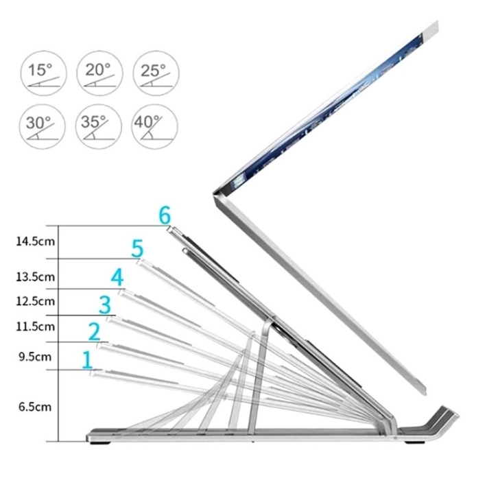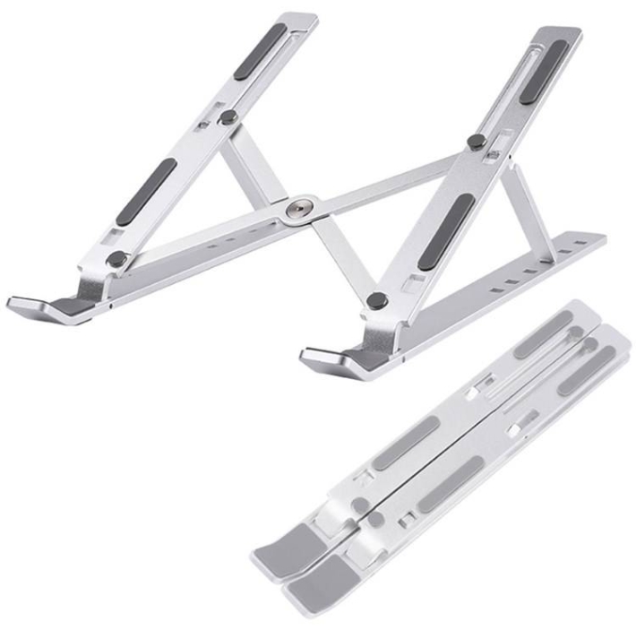Hliníkový, skládací stolek na notebook je ideální varianta pokud potřebujete efektivně a dlouho pracovat na počítači. Vyznačuje se lehkou a pevnou konstrukcí, což umožňuje pohodlné používání notebooku i vleže. Vícestupňové nastavení sklonu desky stolu zajišťuje přizpůsobení stolu potřebám uživatele. Jedná se o extrémně ergonomické řešení, které zvyšuje komfort používání notebooku. Nastavení ramen umožňuje umístit na stojan menší zařízení, jako je příkladně tablet a smartphone. Silikonové podložky na spodní straně zabraňují sklouznutí stojanu a případnému poškrábání.