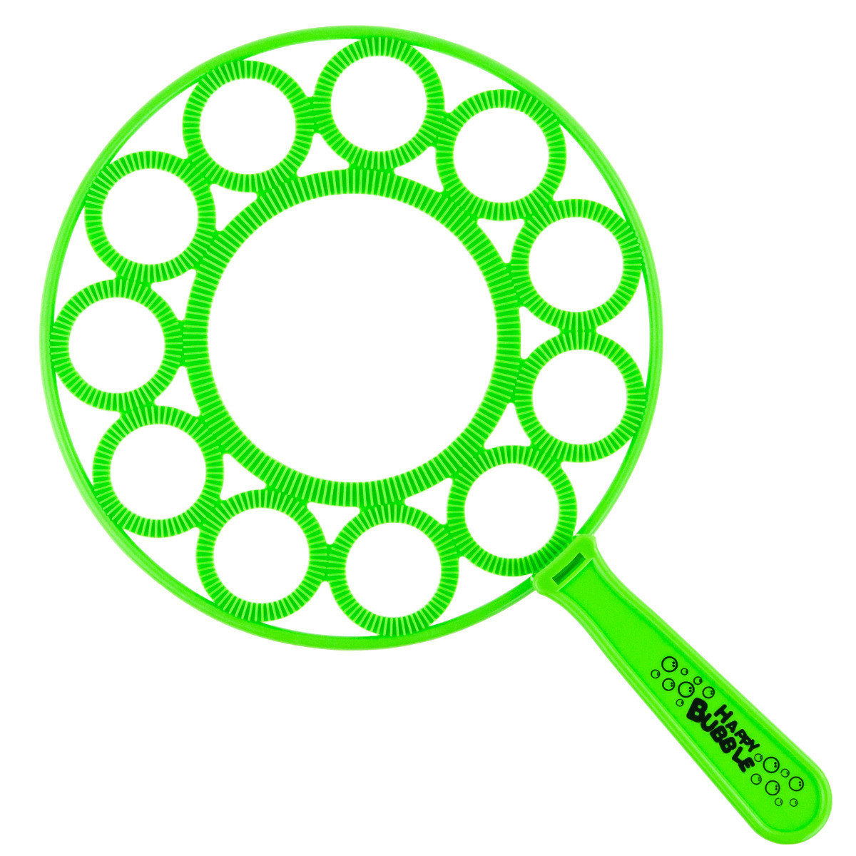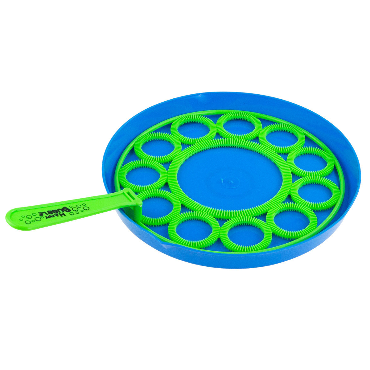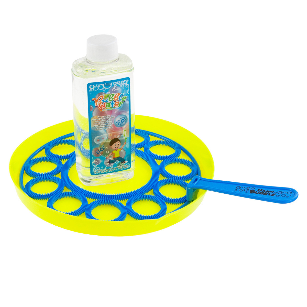 - Obsahuje obruč s kolečky pro vytváření velkého množství barevných bublin.