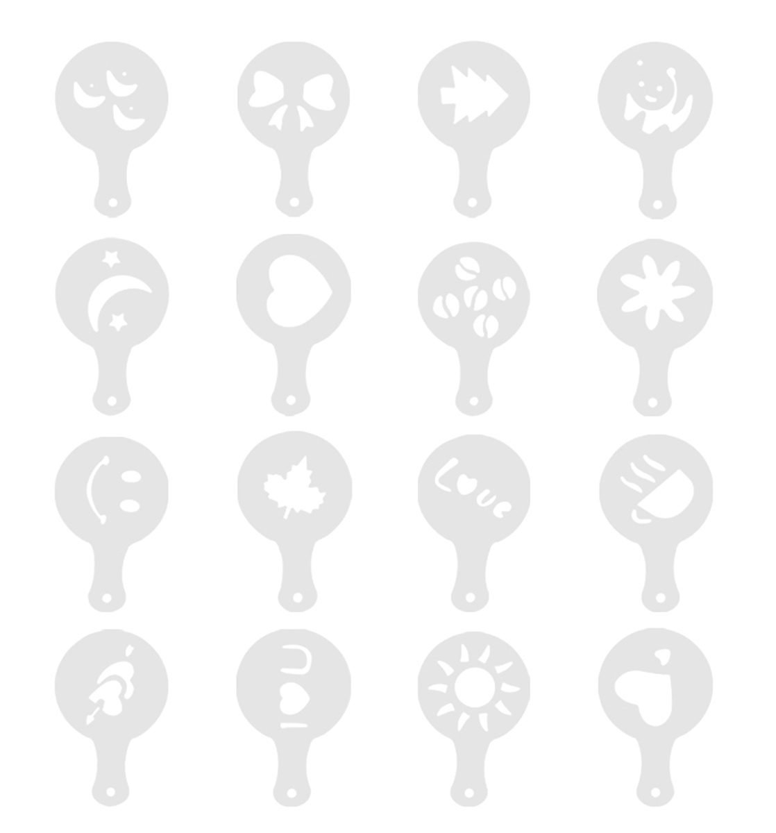 Sada 16 opakovaně použitelných šablon pro zdobení kávy a zákusků. Každý ze vzorů se hodí pro jinou příležitost a náladu, takže si ranní kávu můžete dokonale personalizovat nebo zazářit před svými hosty jako profesionální barista.