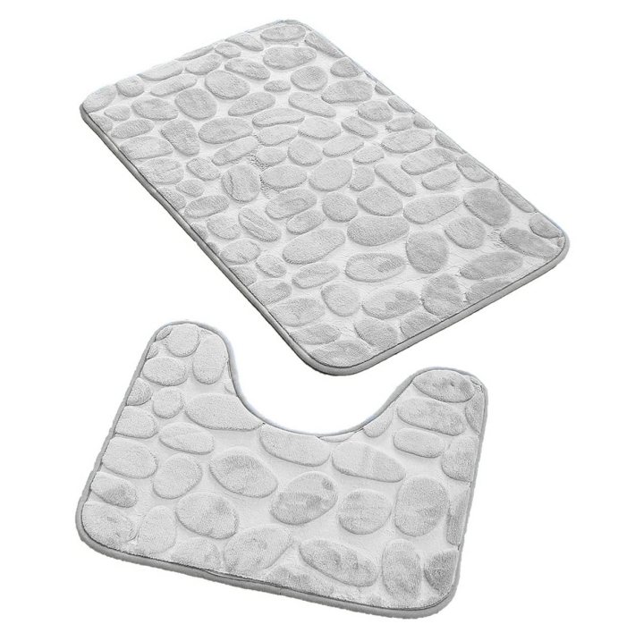 Dokonalý koupelnový set s příjemnou texturou. Set se skládá ze dvou koberečků - klasického koupelnového koberečku a potahu na záchodové prkénko. Už vás nebaví utírat své stopy na mokré podlaze v koupelně? Investujte do koberečku, který účinně absorbuje vlhkost a podlaha ve vaší koupelně bude suchá a ušetříte si další úklid. Díky použitému materiálu jsou koberce měkké, pružné a příjemné na dotek. Mají také schopnost zapamatovat si tvar našich nohou! Na obkladu v koupelně je určitě nerozmrazíte. Díky speciálnímu PVC dnu je protiskluzová.