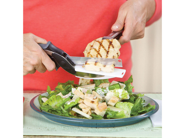 Tyto praktické, univerzální kuchyňské nůžky jsou nezbytnou pomůckou v každé domácnosti. Nejen že s nimi můžete stříhat, ale také krájet či sekat jednotlivé potraviny. Nůžky jsou vyrobeny z kvalitního materiálu, disponují ergonomickou rukojetí, takže manipulace s nimi je snadná a rychlá. Nůžky disponují taktéž pružinovým mechanismem, který usnadňuje krájení či sekání a taktéž mají bezpečnostní pojistku, což umožňuje zavření nůžek a ponechání jich v bezpečnostní poloze. Součástí nůžek je také malé prkénko.